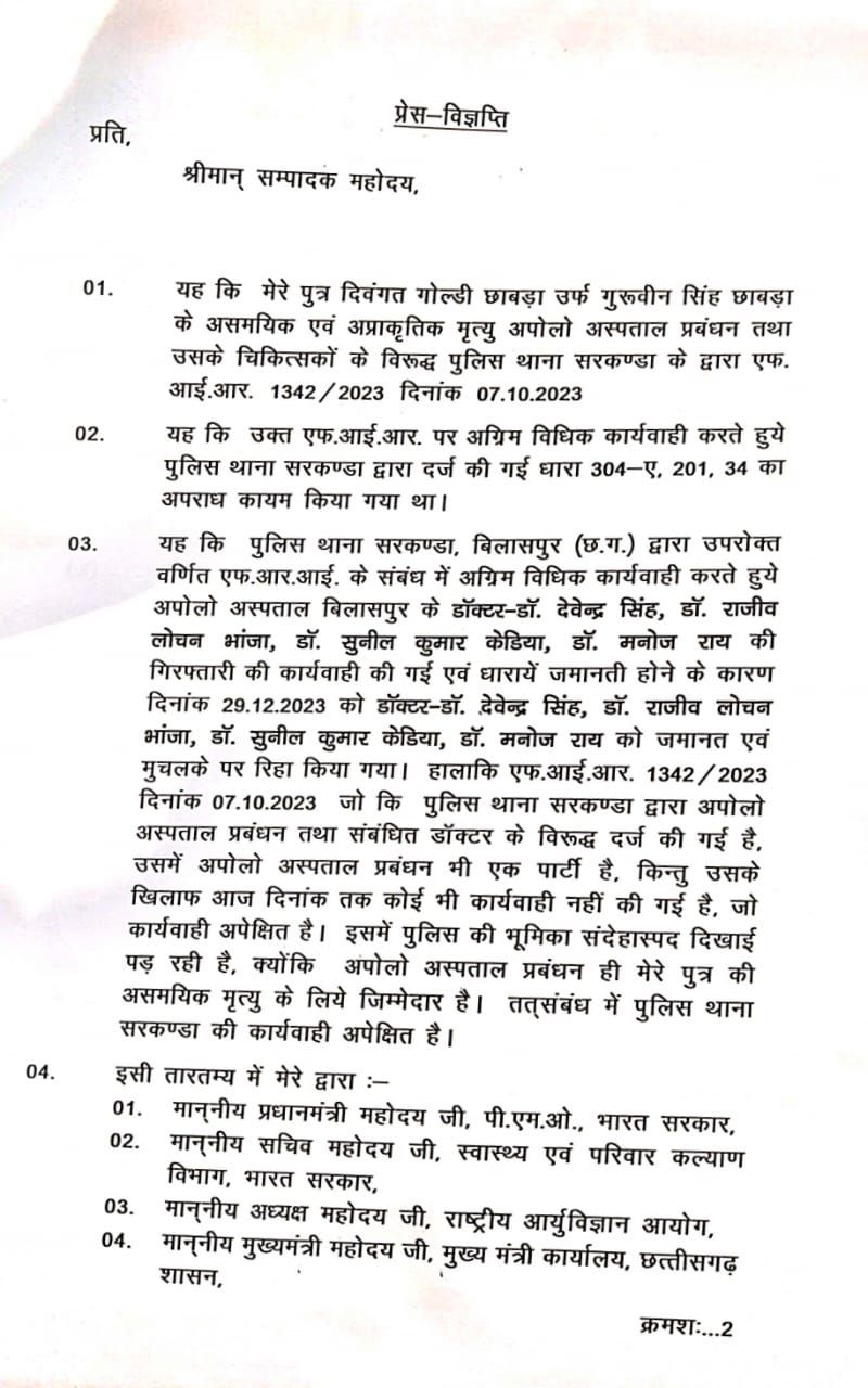 बीते 7 सालो से न्याय के लिए संघर्ष कर रहे मृतक गोल्डी छाबड़ा के परिजनों ने अपोलो प्रबंधन पर कार्रवाई की मांग करते हुए अपोलो हॉस्पिटल और उसके 4 डॉक्टरों डॉ. देवेंदर सिंह, डॉ. सुनील केडिया, डॉ. राजीव लोचन भांजा और डॉ. मनोज राय के मेडिकल प्रेक्टिस लाइसेंस निलंबित करने की मांग करते हुए प्रधानमंत्री कार्यालय, मुख्यमंत्री कार्यालय, मेडिकल काउंसिल ऑफ इंडिया, मेडिकल काउंसिल ऑफ छत्तीसगढ़ समेत दर्जनभर जगहों पर शिकायत की है.. मृतक गोल्डी छाबड़ा के परिजनों ने अलग अलग जिम्मेदारों को 14 पन्नों के आवेदन के साथ 211 पन्नों शिकायत पत्र सौंपा है, और मामले में कड़ी कार्रवाई की मांग की है..