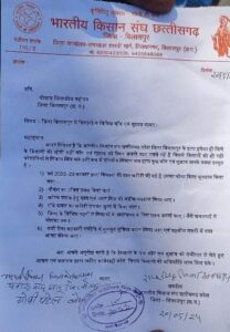 बिलासपुर, छत्तीसगढ़: भारतीय किसान संघ के सदस्यों ने आज कलेक्टर कार्यालय में एक ज्ञापन सौंपा, जिसमें किसानों की विभिन्न समस्याओं का समाधान करने की मांग की गई। इस ज्ञापन में किसानों के लिए धान खरीदी के चौथे किस्त के भुगतान, गौवंश के उचित प्रबंधन, खरीफ फसल के लिए खाद और उन्नत बीज के अग्रीम भंडारण, रवि फसल की समर्थन मूल्य पर खरीदी, जिले की विभिन्न नहरों में सड़क मार्ग के निर्माण, और सेवा सहकारी समितियों में मूलभूत सुविधाओं की उपलब्धता जैसी मांगें शामिल हैं।