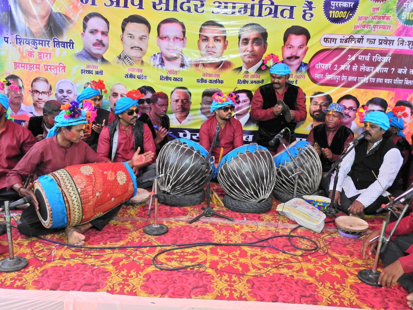 बिलासपुर। होली के अवसर पर बिलासपुर प्रेस क्लब की ओर से 24 मार्च को राघवेंद्र राव सभा भवन परिसर में फाग महोत्सव का आयोजन किया गया। महोत्सव की शुरुआत दोपहर 2 बजे फाग प्रतियोगिता के साथ हुई। प्रतियोगिता में शहर समेत आस–पास के क्षेत्रों की 20 फाग मंडलियों ने हिस्सा लिया। बिलासपुर प्रेस क्लब अध्यक्ष इरशाद अली, उपाध्यक्ष संजीव पांडेय, सचिव दिलीप यादव, कोषाध्यक्ष प्रतीक वासनिक, सहसचिव दिलीप जगवानी और कार्यकारिणी सदस्य गोपीनाथ डे ने सभी मंडलियों का गुलाल लगाकर मंच पर स्वागत किया। प्रतियोगिता के निर्णायक मंडल में शामिल वरिष्ठ पत्रकार रूद्र अवस्थी, श्री दुबे व श्री सोनी ने प्रदर्शन के आधार पर मुंगेली के ठकुरीकापा की महामाया फाग मंडली को पहला, मुंगेली की धरमपुरा फाग मंडली को दूसरा और देवतरा की आदर्श फाग मंडली को तीसरा विजेता घोषित किया। विजेताओं को क्रमशः 21 हजार, 11 हजार और 5100 रुपए का पुरस्कार देकर सम्मानित किया गया।