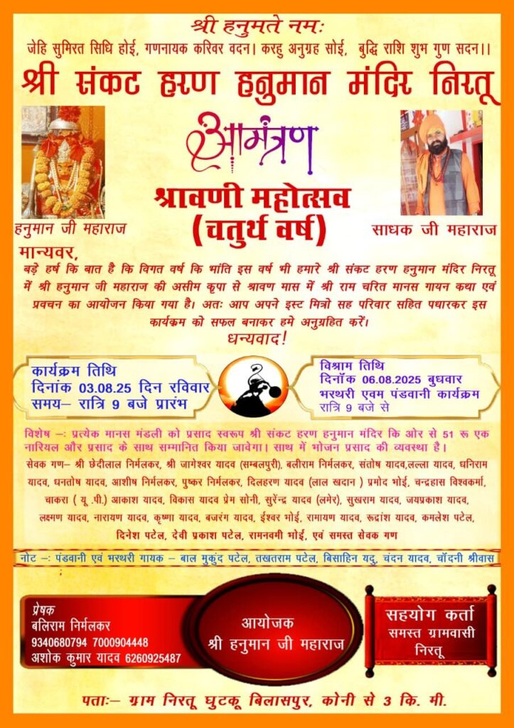 बिलासपुर । जिले के निरतू गांव में स्थित श्री संकट हरण हनुमान मंदिर में श्रावणी महोत्सव (चतुर्थ वर्ष) का भव्य आयोजन होने जा रहा है। हनुमान जी महाराज की असीम कृपा से आयोजित इस महोत्सव में मानस गान कथा और प्रवचन का आयोजन किया जाएगा। आयोजकों ने सभी हनुमान भक्तों से आग्रह किया है कि वे अपने इष्ट मित्रों और परिवार के साथ इस कार्यक्रम में शामिल होकर इसे सफल बनाएं।