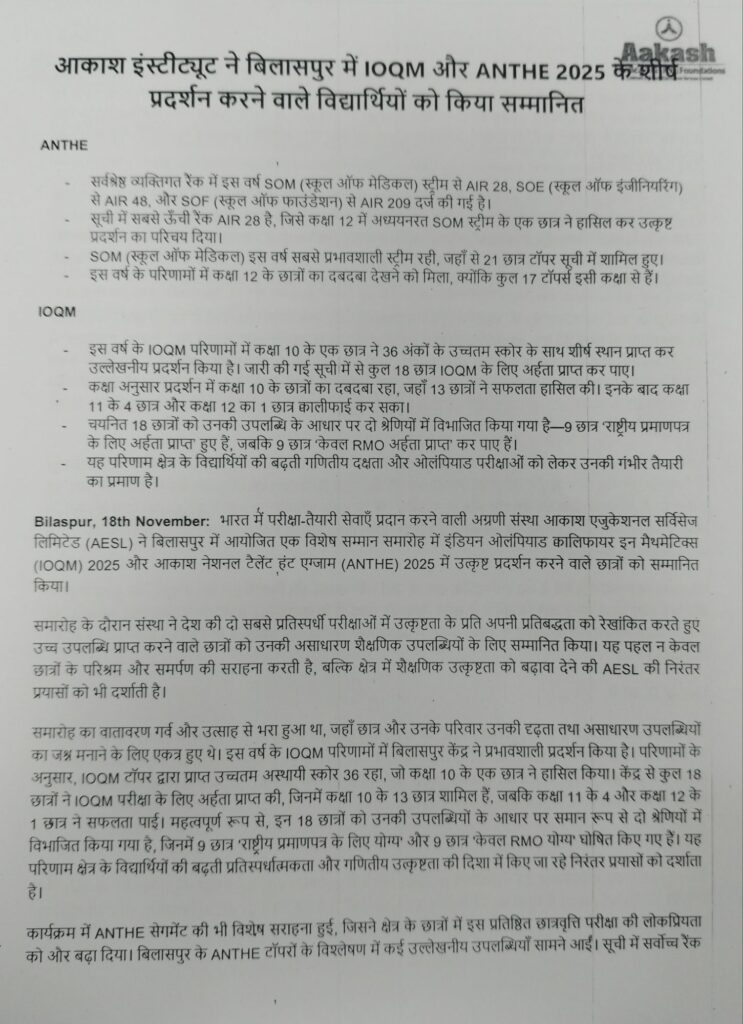 बिलासपुर । भारत की अग्रणी परीक्षा-तैयारी संस्था आकाश एजुकेशनल सर्विसेज लिमिटेड (AESL) ने बिलासपुर में एक विशेष सम्मान समारोह का आयोजन कर IOQM 2025 और ANTHE 2025 में उत्कृष्ट प्रदर्शन करने वाले छात्रों को सम्मानित किया। समारोह गर्व, उत्साह और उपलब्धियों से सराबोर रहा, जहाँ विद्यार्थियों और उनके अभिभावकों ने अपनी मेहनत और समर्पण का जश्न मनाया।