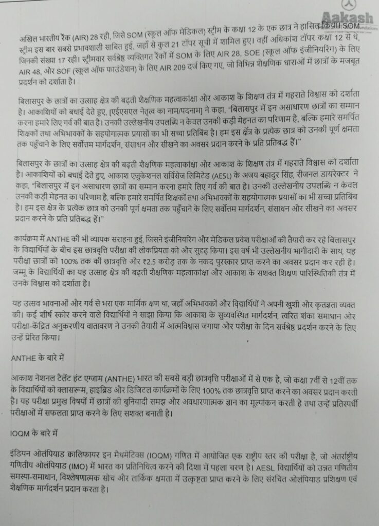 ANTHE ने इस वर्ष भी बिलासपुर के छात्रों में अभूतपूर्व उत्साह पैदा किया। यह परीक्षा छात्रों को 100% तक की छात्रवृत्ति तथा ₹2.5 करोड़ तक के नकद पुरस्कार जीतने का मौका प्रदान करती है। छात्रों ने बताया कि आकाश की परीक्षा-केंद्रित तैयारी, समय पर शंका समाधान और सुव्यवस्थित अध्ययन माहौल ने उनके आत्मविश्वास में वृद्धि की।