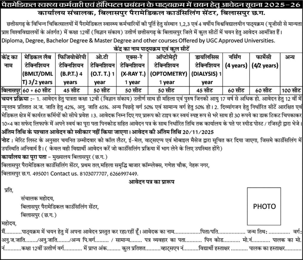 बिलासपुर। स्वास्थ्य सेवाओं में रुचि रखने वाले युवाओं के लिए खुशखबरी है। बिलासपुर पैरामेडिकल काउंसलिंग सेंटर द्वारा सत्र 2025-26 के लिए विभिन्न पैरामेडिकल, नर्सिंग और फार्मेसी कोर्सेस में प्रवेश हेतु आवेदन आमंत्रित किए गए हैं। यह कोर्सेज़ युवाओं को चिकित्सा एवं अस्पताल प्रबंधन के क्षेत्र में रोजगार के सुनहरे अवसर प्रदान करेंगे।