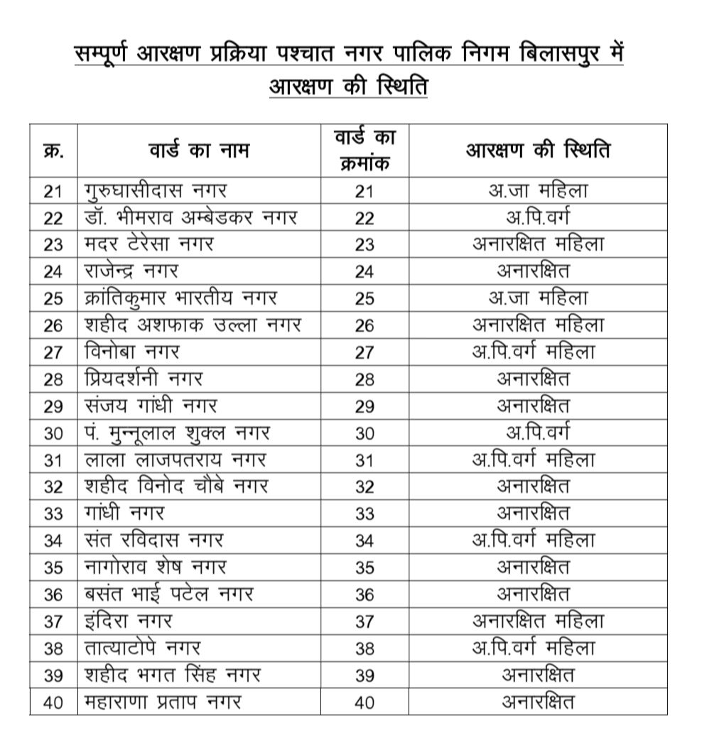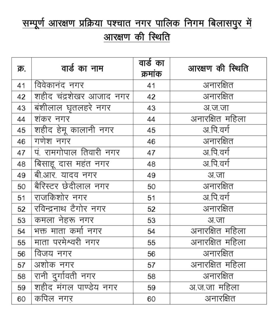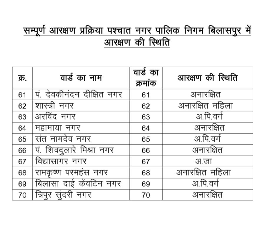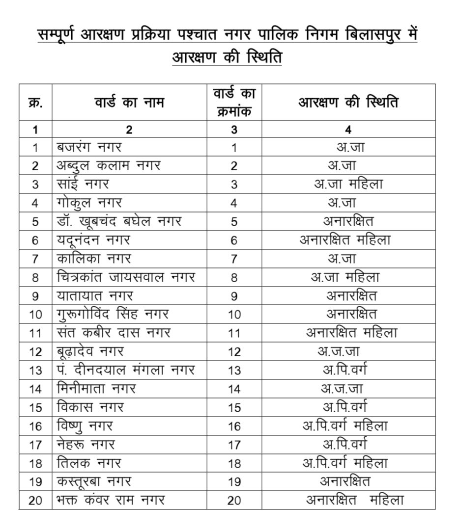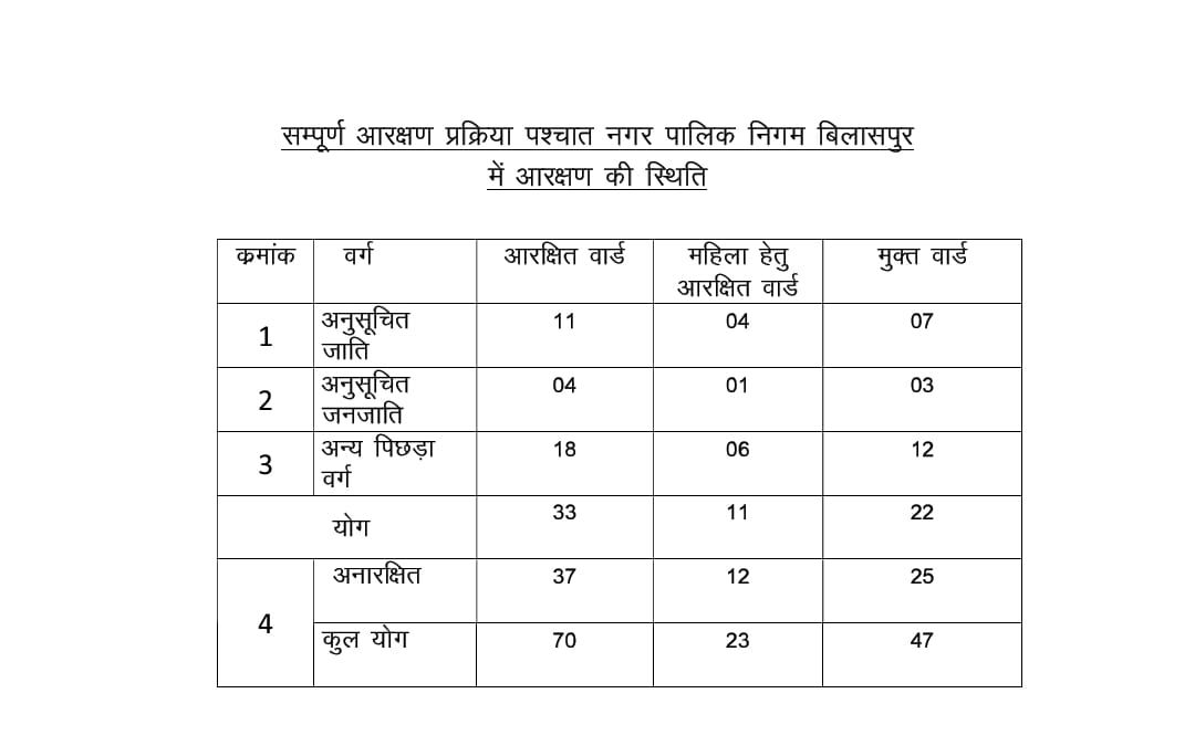 बिलासपुर नगर निगम में वार्ड आरक्षण की घोषणा, महिलाओं को मिला 33% आरक्षण..