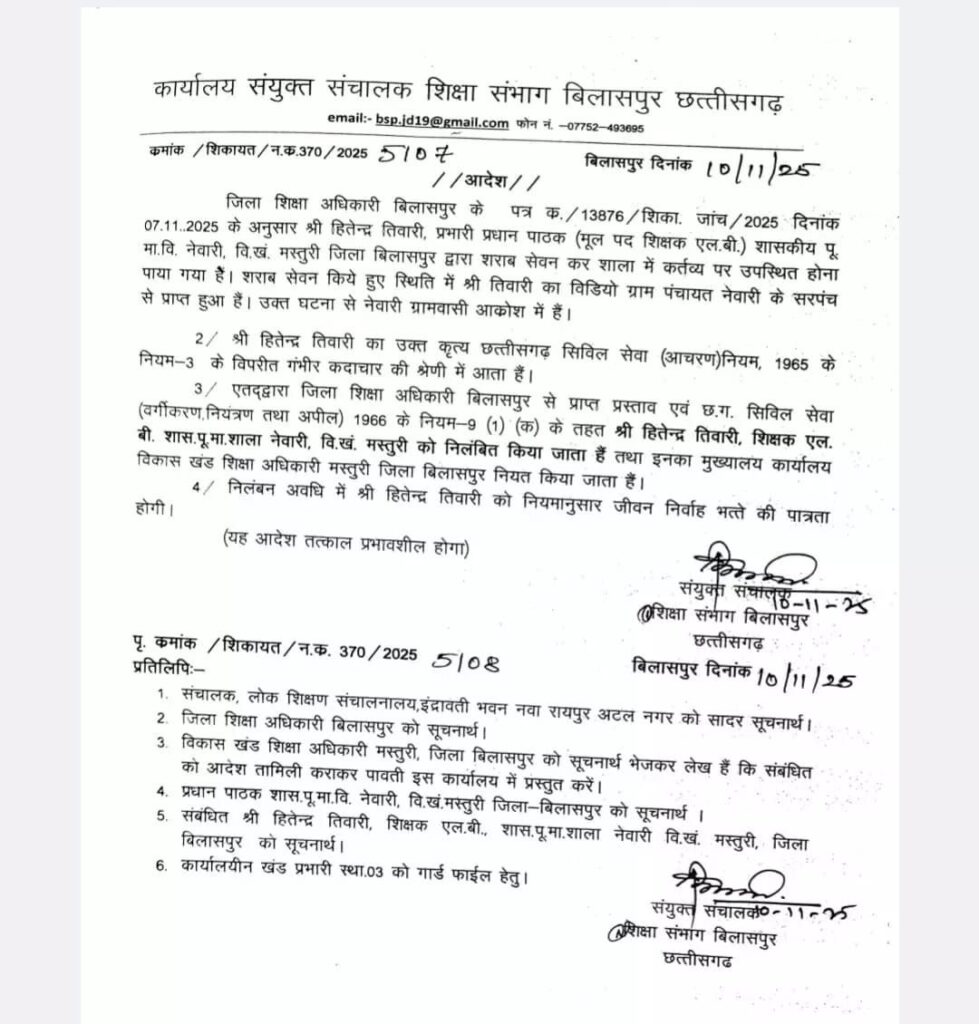 जिला शिक्षा अधिकारी कार्यालय से मिली जानकारी के अनुसार, शासकीय पूर्व माध्यमिक विद्यालय नेवारी विकासखंड मस्तूरी के प्रभारी प्रधान पाठक हितेंद्र तिवारी शराब के नशे में स्कूल आ गए थे। इस शराबी शिक्षक का एक ग्रामीण ने वीडियो बना लिया था, जिसे ग्राम पंचायत नेवारी के सरपंच ने डीईओ को सौंप दिया।