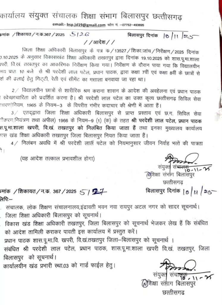शासन के आदेशों की अवहेलना करते हुए बच्चों से इस तरह का काम कराना नियमों के विरुद्ध है, जिसे प्रधान पाठक की स्वेच्छाचारिता माना गया है। परदेशी लाल पटेल को तत्काल प्रभाव से निलंबित कर विकास खंड शिक्षा अधिकारी कार्यालय तखतपुर में अटैच किया गया है।
