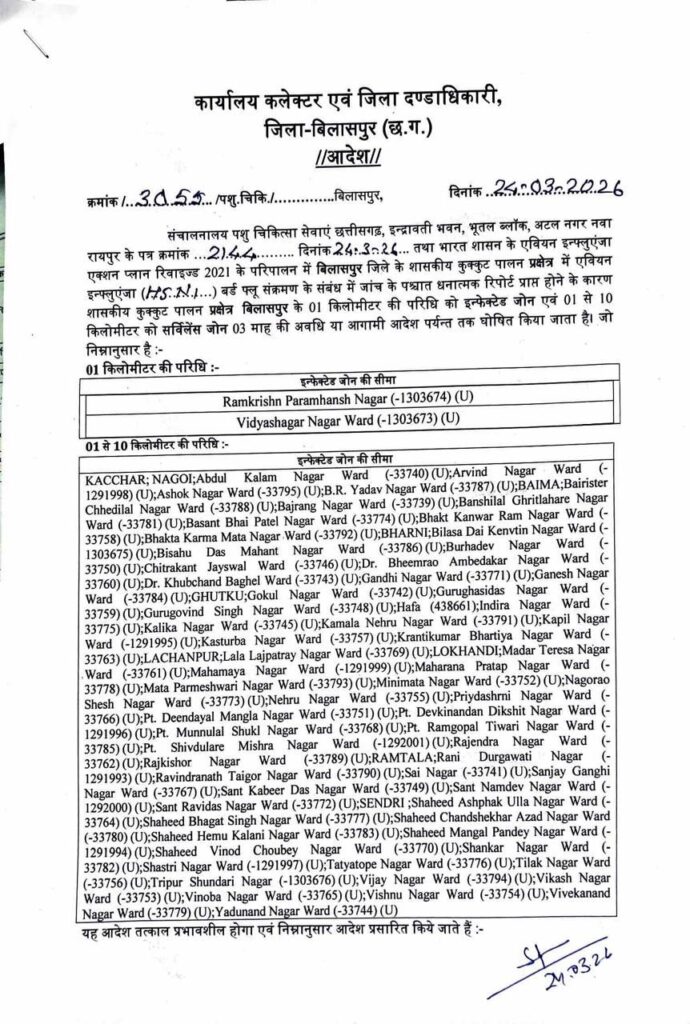 बिलासपुर जिले में बर्ड फ्लू (H5N1) की पुष्टि होने के बाद प्रशासन पूरी तरह से अलर्ट मोड पर आ गया है। कलेक्टर संजय अग्रवाल ने तुरंत कार्रवाई करते हुए प्रभावित पोल्ट्री फार्म के 1 किलोमीटर के दायरे को ‘इन्फेक्टेड जोन’ (संक्रमित क्षेत्र) और 1 से 10 किलोमीटर के इलाके को ‘सर्विलांस जोन’ (निगरानी क्षेत्र) घोषित कर दिया है। इन इलाकों में मुर्गी और अंडे की बिक्री, ट्रांसपोर्ट, और डोर-टू-डोर डिलीवरी पर पूरी तरह रोक लगा दी गई है।
