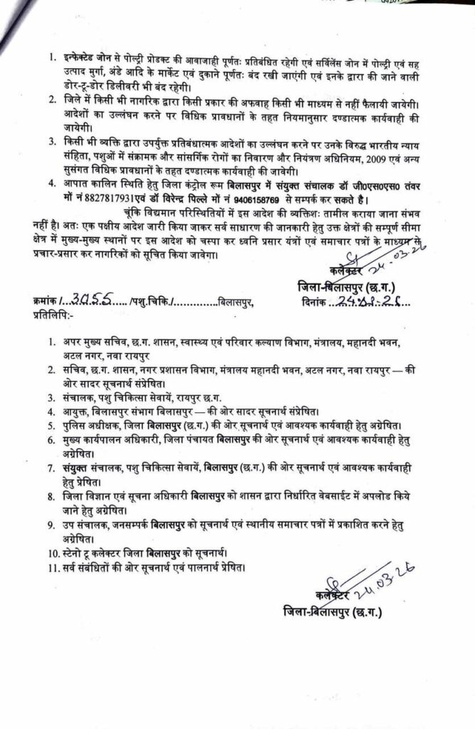 कलेक्टर ने पशुपालन विभाग को साफ निर्देश दिए हैं कि संक्रमित पोल्ट्री और पक्षियों को वैज्ञानिक तरीके से मारा जाए (किलिंग) और उनका सुरक्षित निपटान किया जाए।