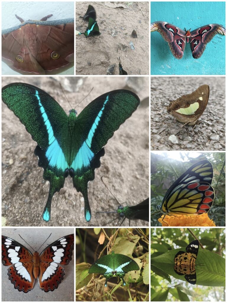 बैंडेड पीकॉक (Banded Peacock),ब्लू मॉरमॉन, कॉमन मॉरमॉन,कॉमन जे, नवाब, राजा,ब्लू टाइगर, वांडरर, ग्रास ब्लू,कॉमन पैंसी, कॉमन ईवनिंग ब्राउन आदि बहुत सी प्रजाति की सुंदर तितलियां हैं।