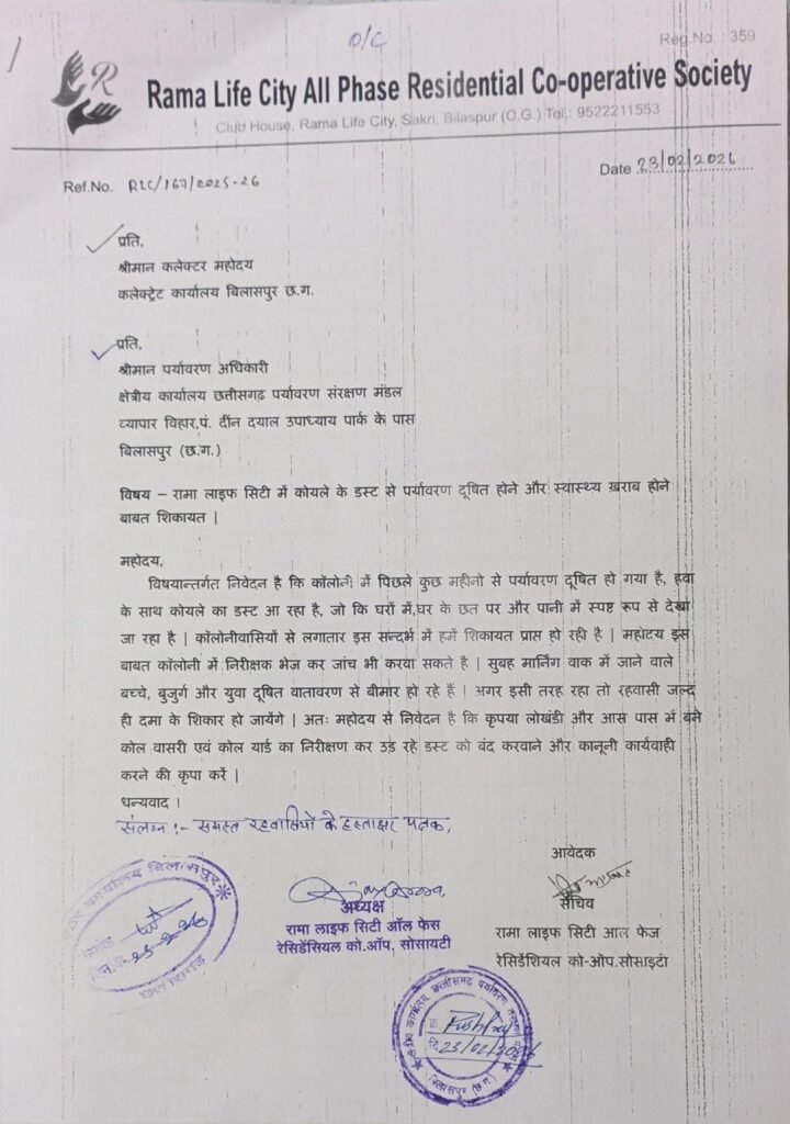 बिलासपुर। सकरी क्षेत्र की रामा लाइफ सिटी, आसमा सिटी सहित आसपास की कॉलोनियों में कोयले की धूल (कोल डस्ट) से फैलते प्रदूषण ने अब गंभीर रूप ले लिया है। धूल के कारण लोगों का दैनिक जीवन प्रभावित हो रहा है और स्वास्थ्य संबंधी चिंताएं भी तेजी से बढ़ रही हैं। लगातार शिकायतों के बावजूद जब कोई ठोस कार्रवाई नहीं हुई, तो अब रहवासियों ने न्यायालय का दरवाजा खटखटाने का फैसला कर लिया है।