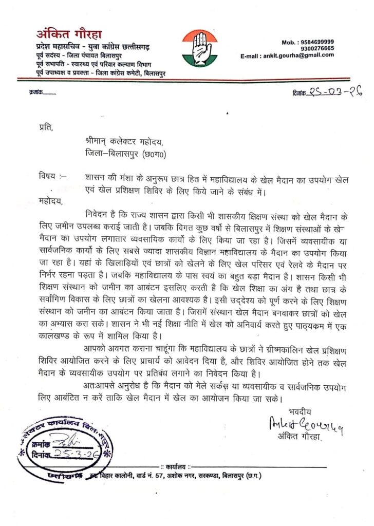 मामला उस समय और गरमा गया जब कांग्रेस नेता अंकित गौरहा खिलाड़ियों के समर्थन में सामने आए। उन्होंने जिला कलेक्टर को ज्ञापन सौंपकर प्रशासन की कार्यप्रणाली पर सवाल उठाए। गौरहा ने कहा कि महाविद्यालय की संपत्तियों पर सबसे पहला अधिकार छात्रों का है और इसमें किसी भी तरह की लापरवाही बर्दाश्त नहीं की जाएगी।