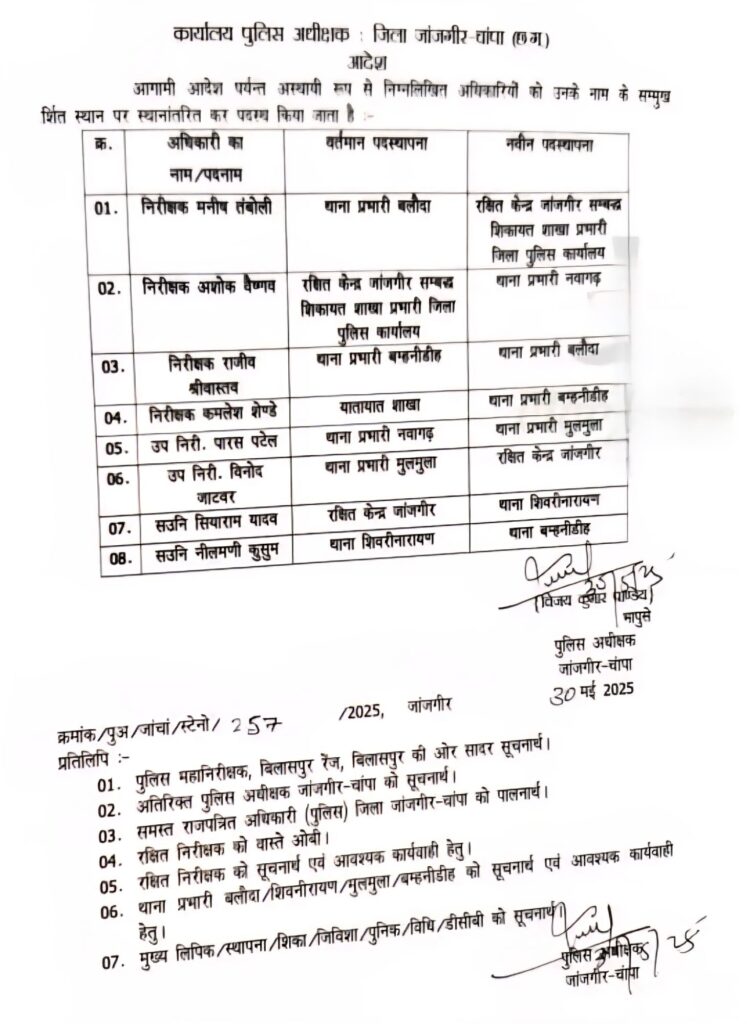 जारी आदेश के मुताबिक, बलौदा थाना प्रभारी मनीष तम्बोली को पुलिस लाइन शिकायत शाखा भेजा गया है, निरीक्षक राजीव श्रीवास्तव को बम्हनीडीह थाना से स्थानांतरित कर बलौदा थाना की कमान सौंपी गई है. वहीं निरीक्षक कमलेश शेंडे को यातायात थाना से स्थानांतरित कर बम्हनीडीह थाना प्रभारी बनाया गया है. उप निरीक्षक पारस पटेल को नवागढ़ थाना से मुलमुला थाना भेजा गया है. उप निरीक्षक विनोद जाटवर को मुलमुला थाना से रक्षित केंद्र, जांजगीर भेजा गया