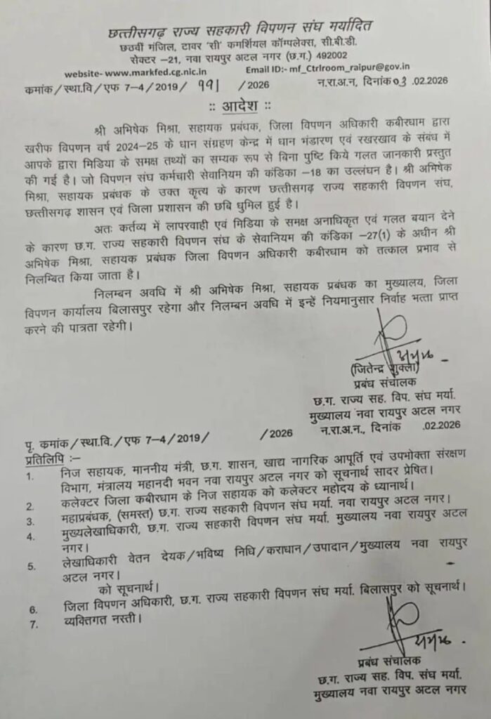इधर राज्य सहकारी विपणन संघ के एमडी जितेन्द्र शुक्ला ने निलंबन आदेश जारी करते हुए बताया कि अभिषेक मिश्रा ने मीडिया के सामने बिना तथ्यों की जांच किए गलत जानकारी दी। इस बयानबाजी से शासन और प्रशासन की छवि खराब हुई है। जितेन्द्र शुक्ला ने स्पष्ट किया कि यह कर्मचारी सेवा नियमों का उल्लंघन है इसलिए मिश्रा को तत्काल प्रभाव से निलंबित कर दिया गया है। निलंबन के दौरान उनका मुख्यालय बिलासपुर तय किया गया है।
