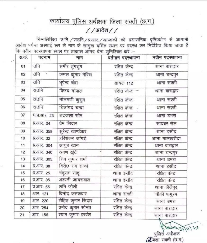 छत्तीसगढ़ के सक्ती जिले में पुलिस अधीक्षक प्रफुल्ल ठाकुर ने प्रशासनिक दृष्टिकोण से एक बड़ी कार्रवाई करते हुए एक ही थाने में लंबे समय से जमे एक उप निरीक्षक (SI), एक सहायक उप निरीक्षक (ASI) समेत 21 पुलिसकर्मियों का तबादला कर दिया है। यह लिस्ट शुक्रवार देर शाम जारी की गई। माना जा रहा है कि यह कदम पुलिस व्यवस्था में कसावट लाने और एक ही स्थान पर अत्यधिक जमाव को रोकने के उद्देश्य से उठाया गया है, ताकि पुलिसिंग और जनहित के कार्यों में गतिशीलता बनी रहे।