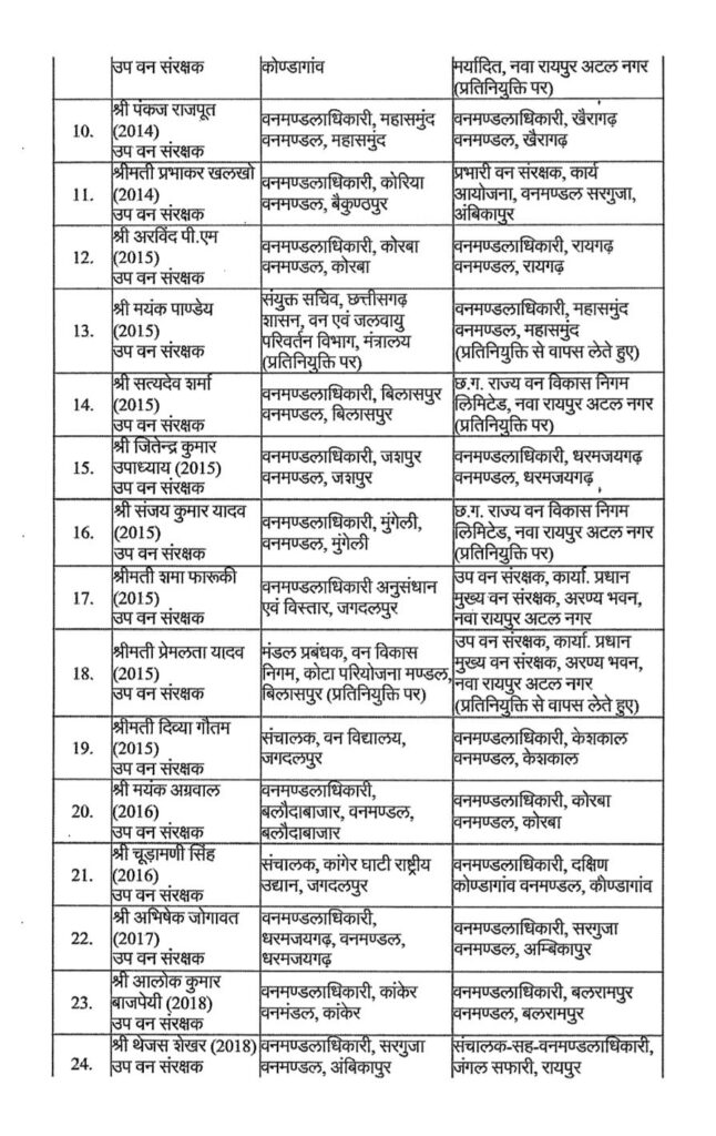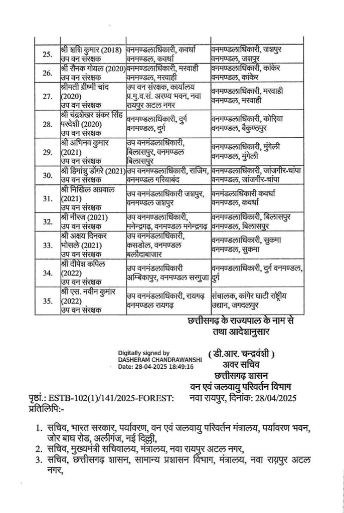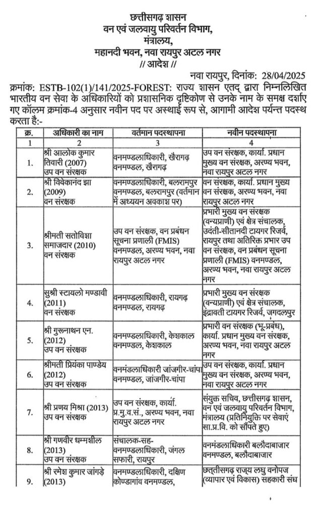 रायपुर। वन एवं जलवायु परिवर्तन विभाग छत्तीसगढ़ शासन ने आज एक बड़ा प्रशासनिक फेरबदल किया है राज्य सरकार ने भारतीय वन सेवा IFS के कई अधिकारियों के दायित्वों में महत्वपूर्ण बदलाव किया है नवा रायपुर स्थित मंत्रालय महानदी भवन से जारी आदेश में कुल 35 IFS अधिकारियों के नाम शामिल हैं।