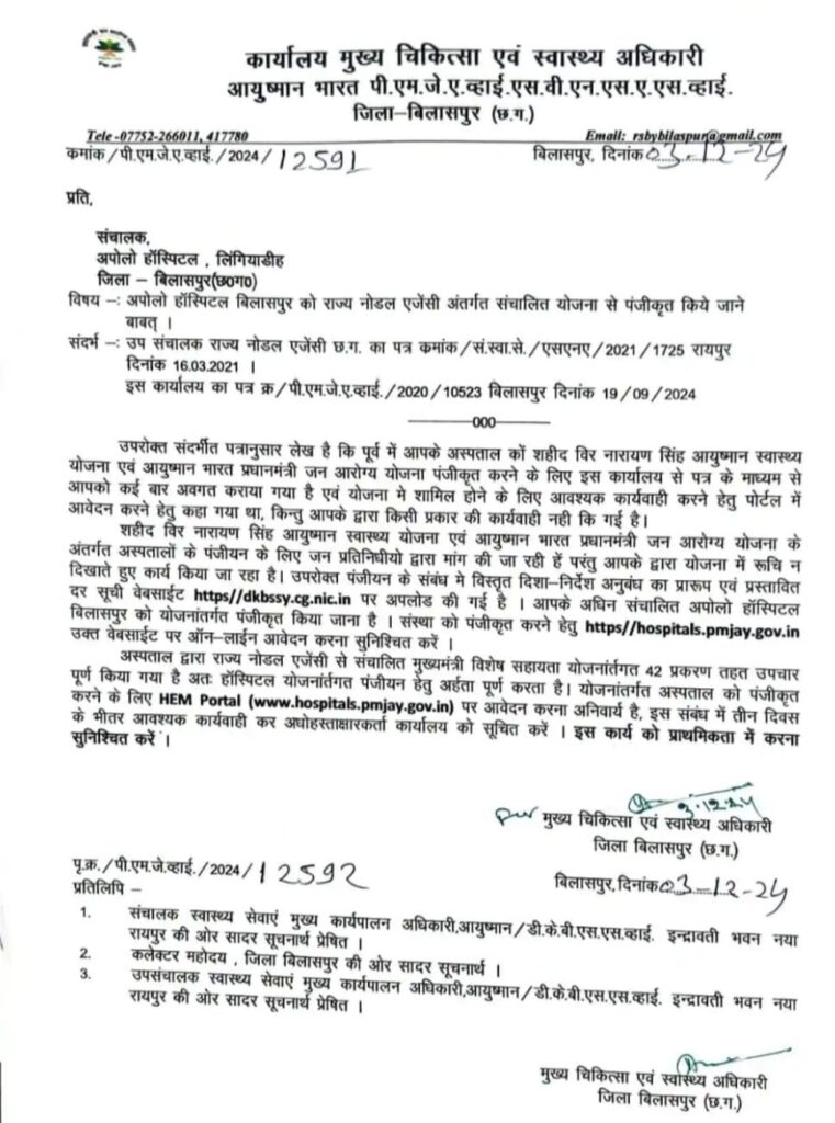 जिला बिलासपुर के मुख्य चिकित्सा एवं स्वास्थ्य अधिकारी (CMHO) द्वारा जारी आधिकारिक पत्र से साफ़ हो गया है कि अपोलो हॉस्पिटल ने आयुष्मान भारत योजना और शहीद वीर नारायण सिंह आयुष्मान स्वास्थ्य योजना में पंजीकरण के लिए आज तक आवेदन ही नहीं किया। हैरानी की बात यह है कि अस्पताल को इस संबंध में कई बार निर्देश और सूचना दी गई, इसके बावजूद कोई पहल नहीं की गई।