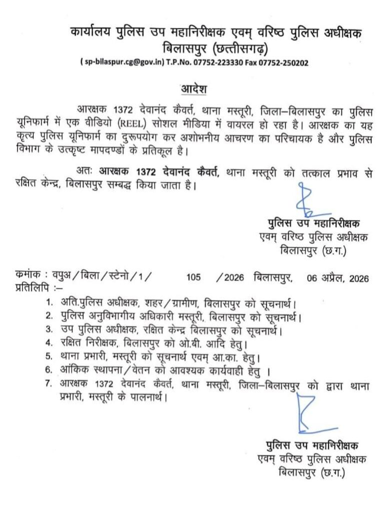 बिलासपुर जिले के मस्तूरी थाना में पदस्थ आरक्षक देवानंद कैवर्त पर विभागीय कार्रवाई की गई है।दरअसल, आरक्षक का एक वीडियो सोशल मीडिया पर तेजी से वायरल हुआ, जिसमें वह पुलिस की वर्दी पहनकर गाने पर नाचते हुए नजर आ रहा है। वीडियो सामने आते ही विभाग ने इसे गंभीरता से लिया और जांच के बाद तत्काल कार्रवाई करते हुए संबंधित आरक्षक को मस्तूरी थाने से हटाकर रक्षित केंद्र बिलासपुर अटैच कर दिया।