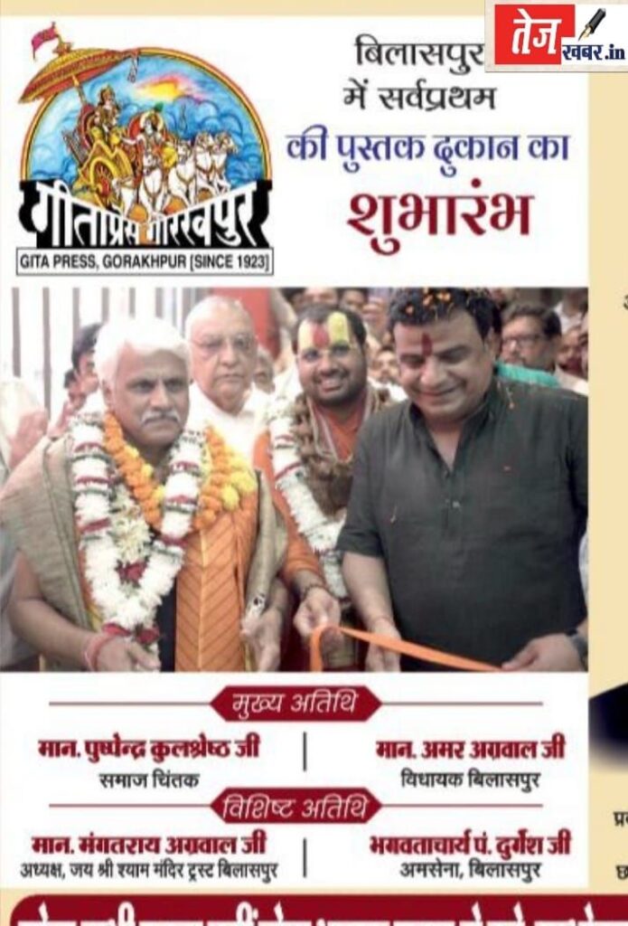 इसी मौके पर बिलासपुर में गीता प्रेस गोरखपुर की पुस्तक दुकान का भी शुभारंभ हुआ। सदर बाजार में स्थित इस दुकान का शुभारंभ पुष्पेंद्र कुलश्रेष्ठ और नगर विधायक अमर अग्रवाल ने किया। इस दौरान जय श्री श्याम मंदिर ट्रस्ट के अध्यक्ष मंगतराय अग्रवाल और भागवताचार्य पंडित दुर्गेश अमसेना भी मौजूद रहे। कार्यक्रम में छत्तीसगढ़ सराफा एसोसिएशन के प्रदेश अध्यक्ष कमल सोनी सहित कई सदस्य और नागरिक बड़ी संख्या में उपस्थित थे।
