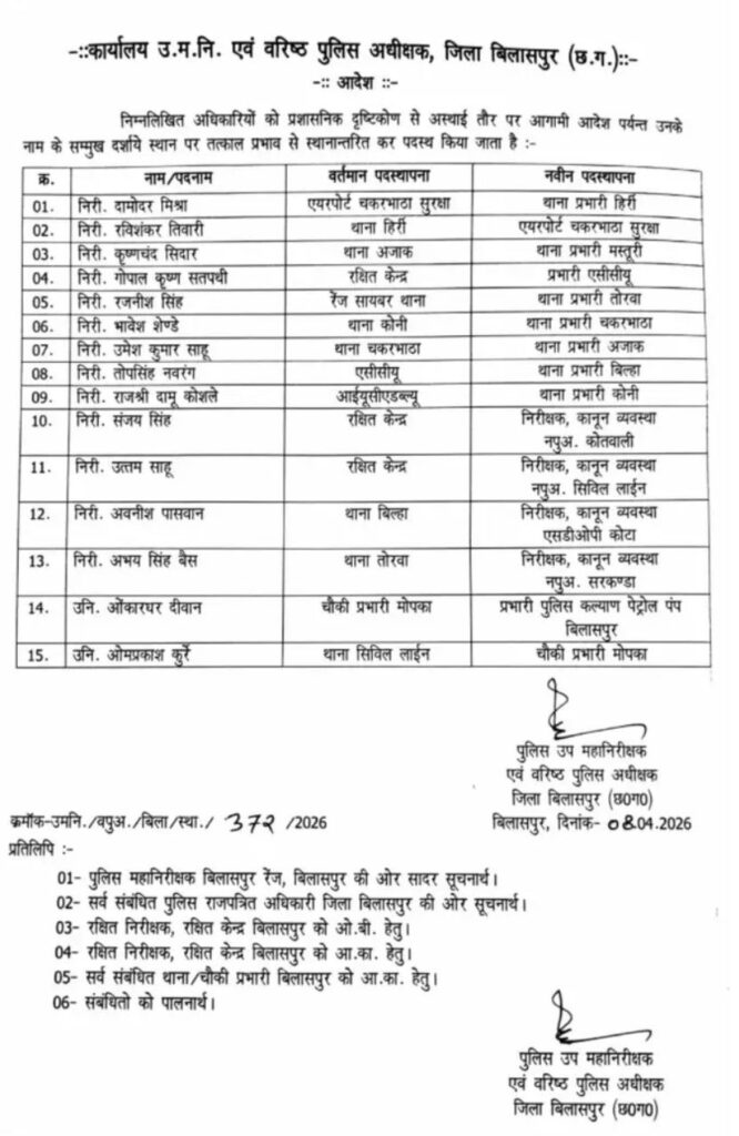 बिलासपुर पुलिस महकमे में एक बहुत बड़ा और कड़ा फेरबदल हुआ है। एसएसपी रजनेश सिंह ने जिले की पुलिसिंग का पूरा ढांचा ही बदल डाला है। एक साथ 33 अधिकारियों और कर्मचारियों के तबादले कर दिए गए हैं। सबसे खास बात यह है कि अब सीएसपी और एसडीओपी दफ्तरों में सीधे इंस्पेक्टर स्तर के अधिकारी बैठेंगे। बिलासपुर के इतिहास में ऐसा प्रयोग पहली बार हो रहा है। इस सख्त फैसले ने पुलिस महकमे में जबरदस्त खलबली मचा दी है। सुस्त और लापवाह थानेदारों को सीधे लूप लाइन का रास्ता दिखा दिया गया है। जो थानेदार अब तक थानों में बैठकर सिर्फ मलाई काट रहे थे उनकी कुर्सी छिन गई है।