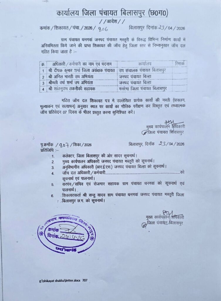 बिलासपुर। जिले के मस्तूरी जनपद पंचायत के अंतर्गत आने वाले ग्राम पंचायत धनगंवा में लगभग एक करोड़ रुपये के कथित वित्तीय घोटाले का मामला सामने आने के बाद जिला प्रशासन ने सख्त कदम उठाए हैं। शिकायतों को गंभीरता से लेते हुए जिला पंचायत के मुख्य कार्यपालन अधिकारी ने पूरे मामले की जांच के आदेश जारी कर दिए हैं। साथ ही निष्पक्ष जांच के लिए चार सदस्यीय टीम गठित की गई है, जिसे 7 दिन के भीतर अपनी विस्तृत रिपोर्ट सौंपने के निर्देश दिए गए हैं।