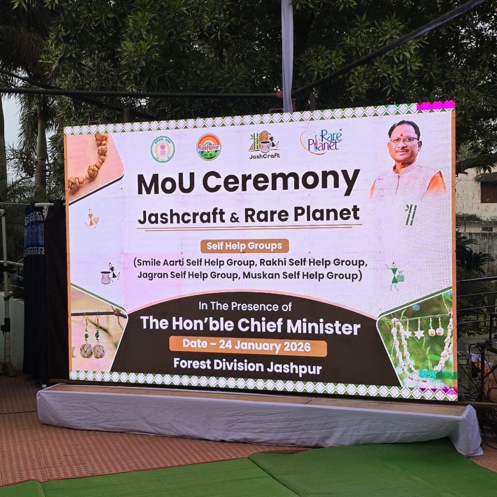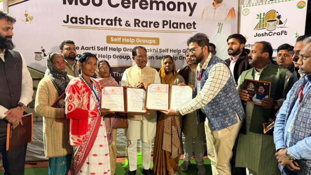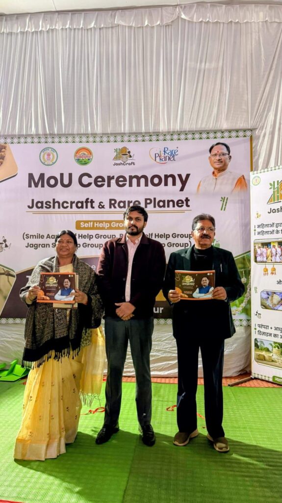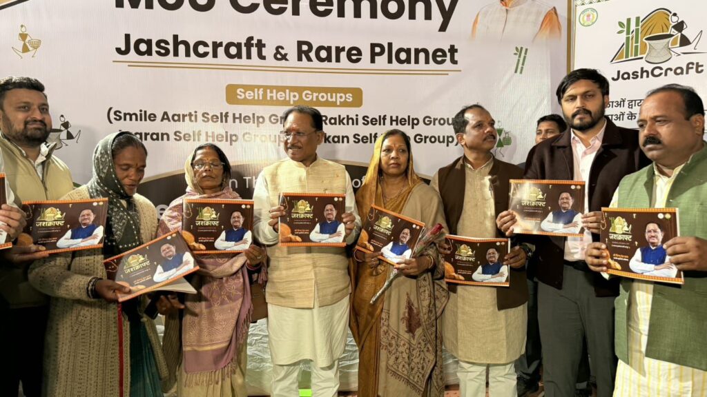 जशपुर। जशपुर के जंगलों और गांवों में तैयार होने वाले हस्तशिल्प अब देश के बड़े हवाई अड्डों की शोभा बढ़ाएंगे। 24 जनवरी 2026 को मुख्यमंत्री की मौजूदगी में जश क्राफ्ट और रेयर प्लैनेट के बीच एक बड़ा समझौता हुआ। इस समझौते के बाद अब स्वयं सहायता समूह की दीदियों और वन प्रबंधन समितियों के बनाए सामानों को देश भर के एयरपोर्ट्स पर ग्लोबल मार्केट मिलेगा।