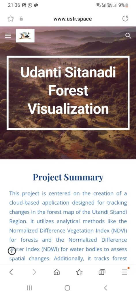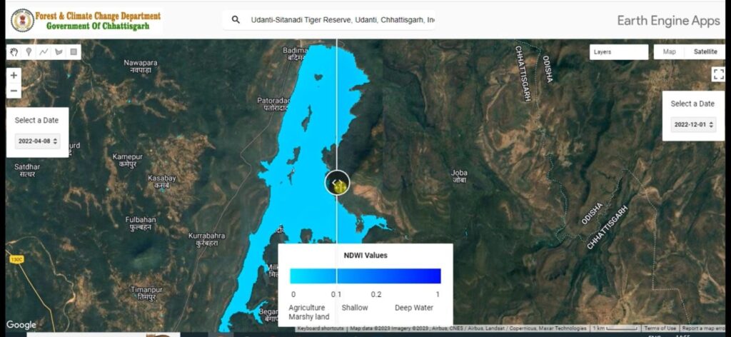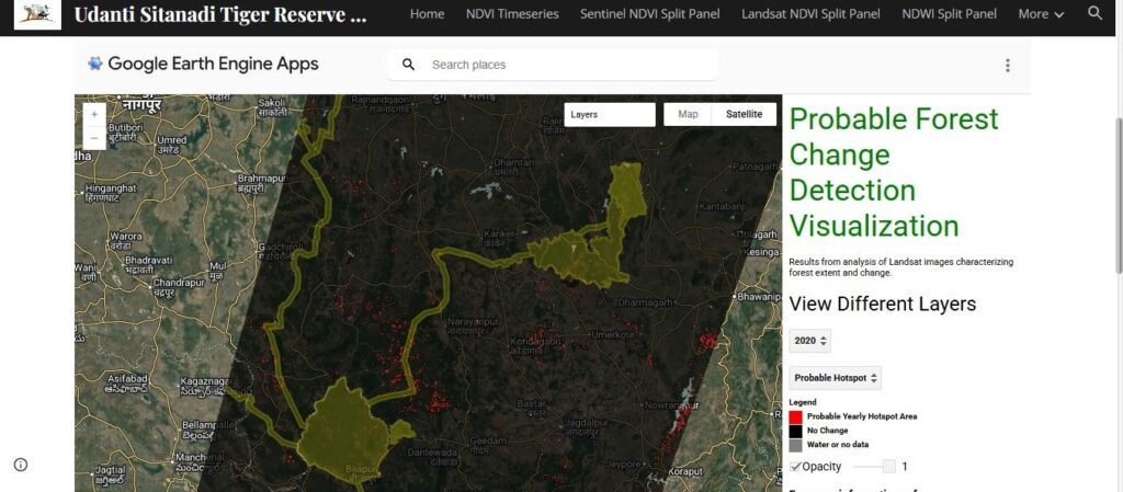 USTR का दूसरा नवाचार गूगल अर्थ इंजन आधारित रिमोट सेंसिंग और ड्रोन मैपिंग पोर्टल है, जो वन संसाधनों की निगरानी और प्रबंधन में महत्वपूर्ण भूमिका निभा रहा है। यह पोर्टल छत्तीसगढ़ और पड़ोसी राज्यों के 10 किलोमीटर के सीमावर्ती क्षेत्रों की सैटेलाइट छवियों पर एआई-एमएल का उपयोग करके वन आवरण में कमी, अवैध कटाई और सतही जल हानि का पता लगाने में मदद करता है।