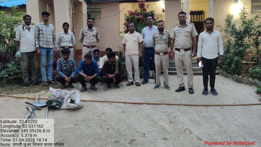 डीएफओ नीरज कुमार के निर्देश और उपवनमंडल अधिकारी कोटा अनिल भास्करन के मार्गदर्शन में यह कार्रवाई की गई। वन परिक्षेत्र अधिकारी बेलगहना देव सिंह मरावी के नेतृत्व में टेंगनमाड़ा की टीम को 31 मार्च 2026 को मुखबिर से सूचना मिली थी कि अट्टडा गांव में जंगली सुअर का मांस पकाया जा रहा है।